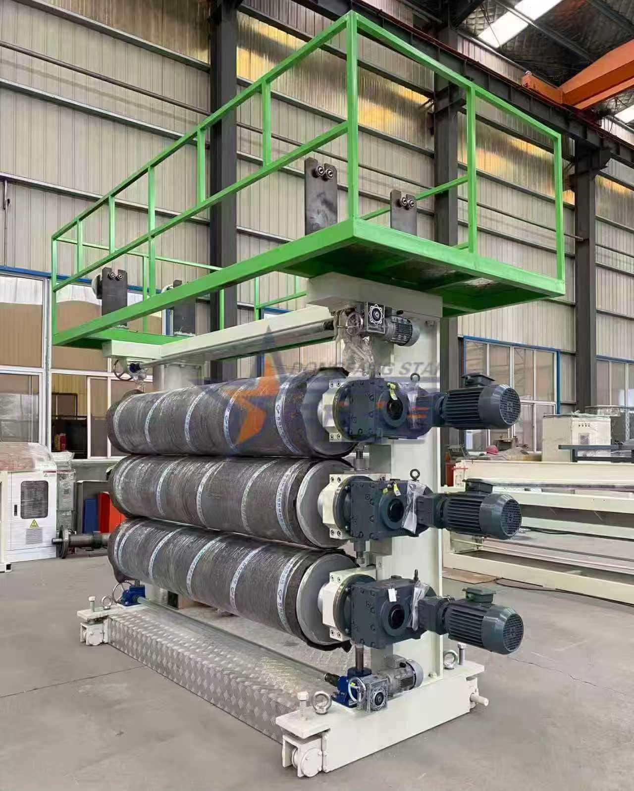 Descrizione: Rulli con finitura a specchio di grande diametro ∮450mm×2200mm (durezza RC60-65) con controllo della temperatura e sistemi di azionamento indipendenti. La temperatura uniforme e costante della superficie del rullo consente una rapida modellatura ed eliminazione dei segni di flusso, fondamentali per produrre involucri di elettrodomestici e pannelli pubblicitari di alta qualità.