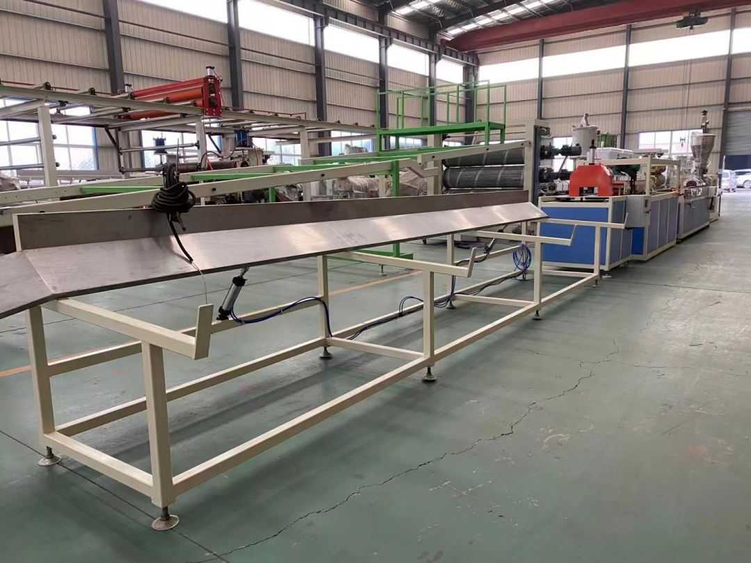 Linea di produzione di profili La linea di produzione dei profili utilizza estrusori bivite conici della serie SJSZ-65/132, piattaforme di formatura sottovuoto in acciaio inossidabile, trattori cingolati, macchine integrate per il taglio automatico e scaffalature di scarico ribaltabili. La piattaforma di modellatura è dotata di una pompa per vuoto ad alta pressione e di una pompa dell'acqua, regolabili quadridimensionalmente. Il trattore viene bloccato pneumaticamente. La macchina da taglio automatica a lunghezza fissa utilizza un interruttore di corsa per tagliare a una lunghezza fissa. La scaffalatura impilabile è lunga 6 metri, realizzata in acciaio inossidabile e ribaltata pneumaticamente.