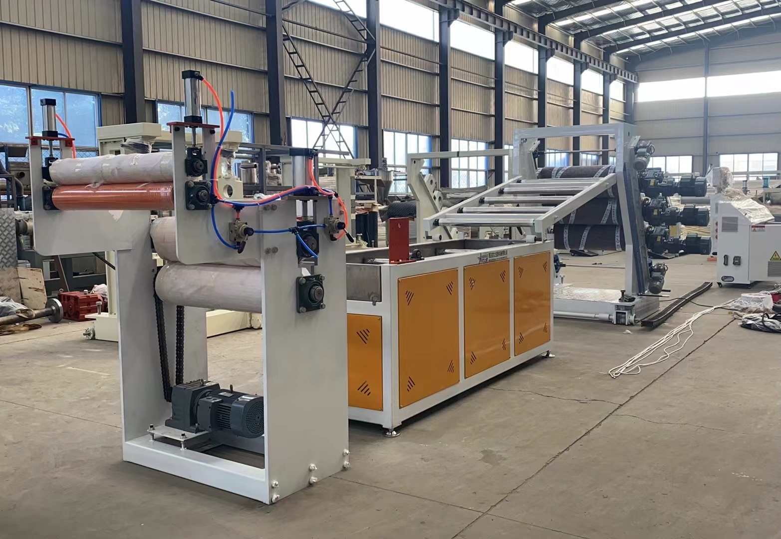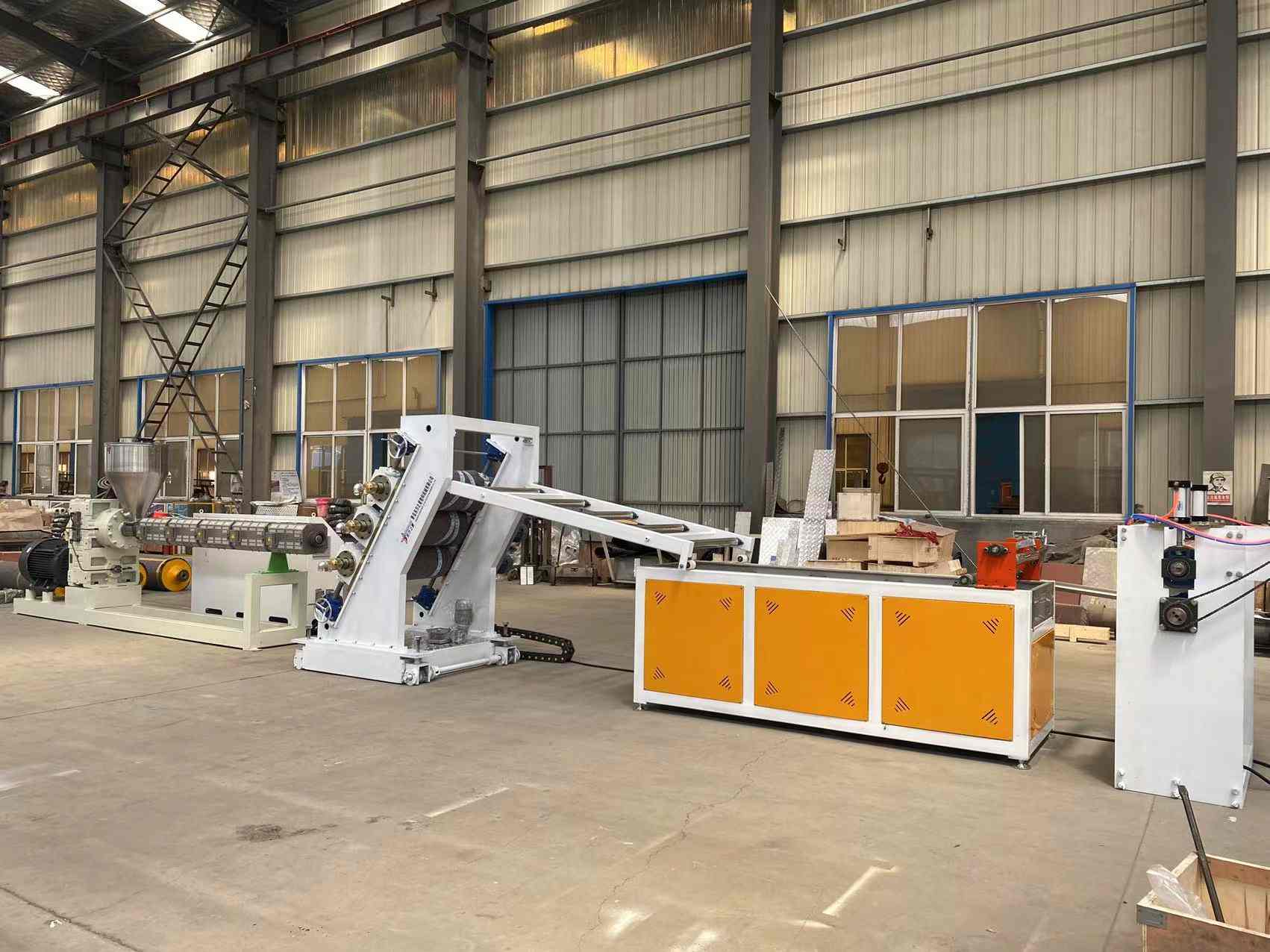 Presentazione di una linea di produzione all'avanguardia progettata per la produzione di linee di produzione di tende per porte trasparenti in PVC. Questo sistema all'avanguardia è progettato per produrre lastre di plastica trasparente in PVC con una larghezza che va da 200 a 600 millimetri e uno spessore che varia da 0,8 a 3 millimetri. La linea di produzione è dotata di una vasta gamma di macchinari, tra cui una scelta di estrusori monovite SJ90 o SJ-120, una versatile filiera flessibile a forma di T e l'opzione per una calandra a tre rulli verticale o inclinata a 45 gradi. Inoltre, è dotato di un controller della temperatura dell'acqua tre in uno, una staffa di raffreddamento in acciaio inossidabile con un coltello da rifinitura regolabile ad ampia larghezza, una macchina per la trazione del rullo in gomma e un avvolgitore per albero ad espansione dell'aria a doppia posizione.