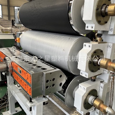 Lo stampo con canale di flusso gradiente in stile appendiabiti da 1.150 mm garantisce una distribuzione uniforme della fusione su tutta la larghezza. La calandra a tre rulli di grande diametro da ∮400 mm, attraverso il controllo preciso della temperatura e della pressione con rulli con finitura a specchio, produce substrati di alta qualità con tolleranze di spessore ridotte, basse tensioni interne e una superficie liscia, un prerequisito cruciale per la successiva goffratura di texture "guscio di tartaruga" chiare e durevoli.