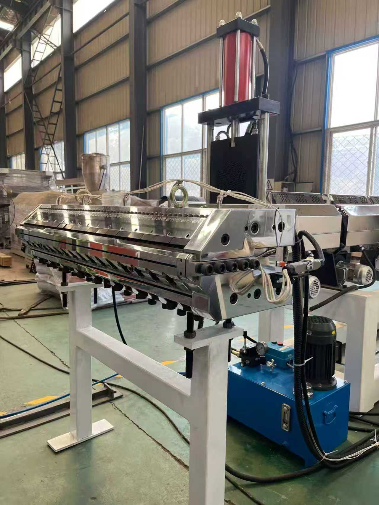 Linea di produzione di estrusione di tubi rinforzati con filo di acciaio in PVCTappetini per auto con attrezzatura antiscivolo TPE-1000mm: l'attrezzatura è costituita principalmente da un estrusore monovite, una calandra a tre rulli, una staffa di raffreddamento da 6 metri, una macchina per trazione a rulli in gomma, una cesoia e un dispositivo a nastro trasportatore.