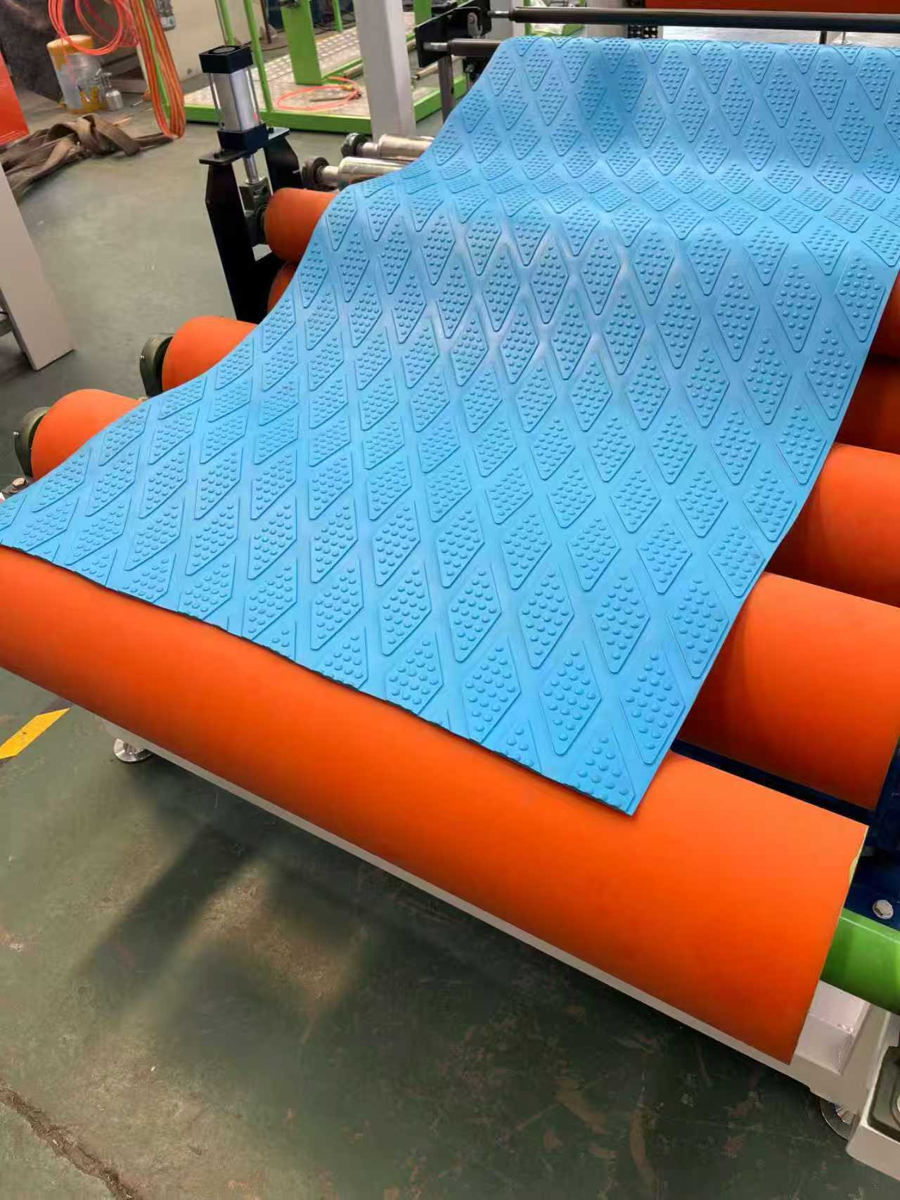 La linea di produzione di tappetini compositi in TPE + moquette o altri substrati tessili sviluppata in modo indipendente da Oriental Star è una linea di produzione all'avanguardia per materiali per interni automobilistici. Questa apparecchiatura utilizza una vite PTE appositamente progettata per una plastificazione uniforme. Combinato con un processo composito unico, il prodotto risultante presenta una forte adesione, nessuna deformazione a trazione ed è privo di formaldeide. Questa apparecchiatura è stata adottata da numerosi produttori e fornitori di tappetini di marchi automobilistici nazionali e internazionali ed è stata esportata in paesi come Corea del Sud, Giappone ed Egitto.